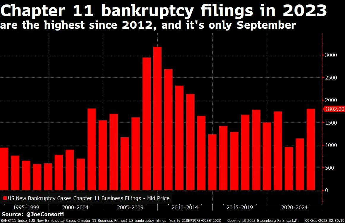 Dữ liệu từ @JoeConsorti cho thấy, số lượng hồ sơ xin phá sản theo chương 11 trong những tháng gần đây tăng đột biến. Đến tháng 9 này, tổng số hồ sơ xin phá đã lập mức cao nhất trong 11 năm qua. Con số này có lẽ sẽ còn tiếp tục tăng cho đến hết năm 2023.