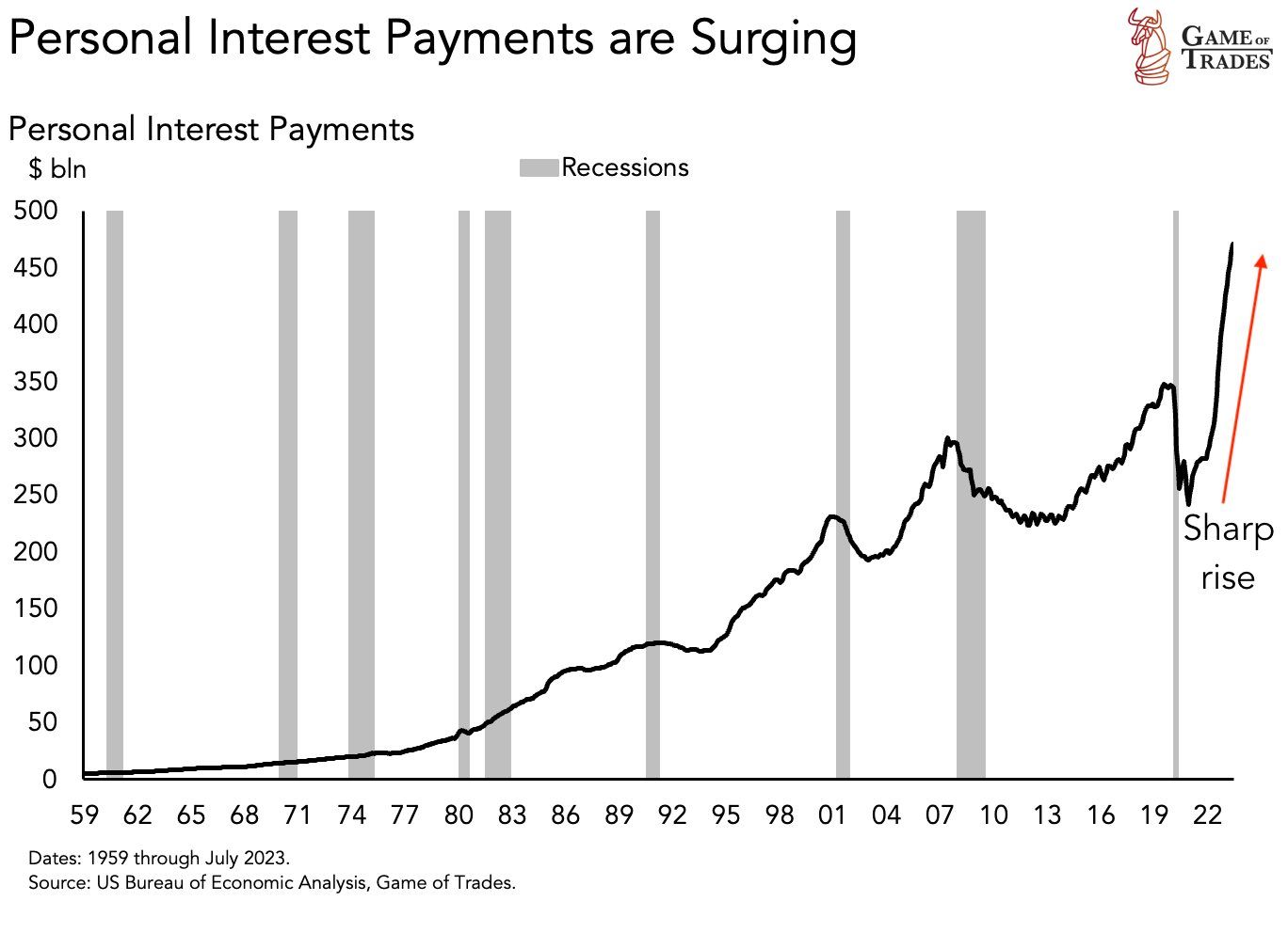 - Chỉ từ năm 2021 đến nay, số lãi phải trả của cá nhân đã tăng 81%. Con số này thậm chí không bao gồm lãi suất thanh toán thế chấp. Đà tăng lãi suất của FED đã gia tăng áp lực lãi suất trên những khoản tín dụng cá nhân.