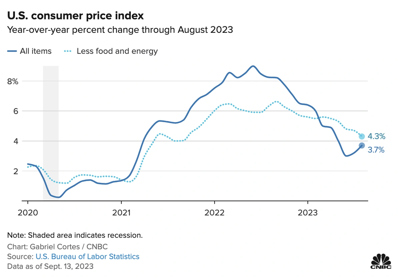 Số liệu CPI tháng 8 vừa mới công bố cho thấy CPI có dấu hiệu tăng trở lại mạnh nhất cả năm 2023, và đà giảm của Core CPI đã chậm lại đáng kể. CPI và Core CPI tăng lần lượt là 3.7% và 4.3% so với cùng kỳ năm ngoái. Nguyên nhân chính khiến CPI tăng mạnh trong tháng 8 có thể vì giá năng lượng và giá xăng tăng mạnh.