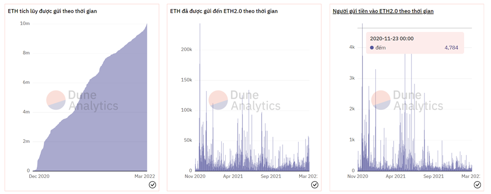Theo thống kê từ dune.xyz, hợp đồng đặt cọc Ethereum 2.0 đang khóa hơn 10 triệu ETH (hơn 26 tỷ USD). Số lượng nhà đầu tư gửi coin vào hợp đồng lên tới 67,073 tài khoản. Tuy nhiên, khoảng thời gian chứng kiến lượng staking nhiều nhất là trước ngày 01/12/2020.