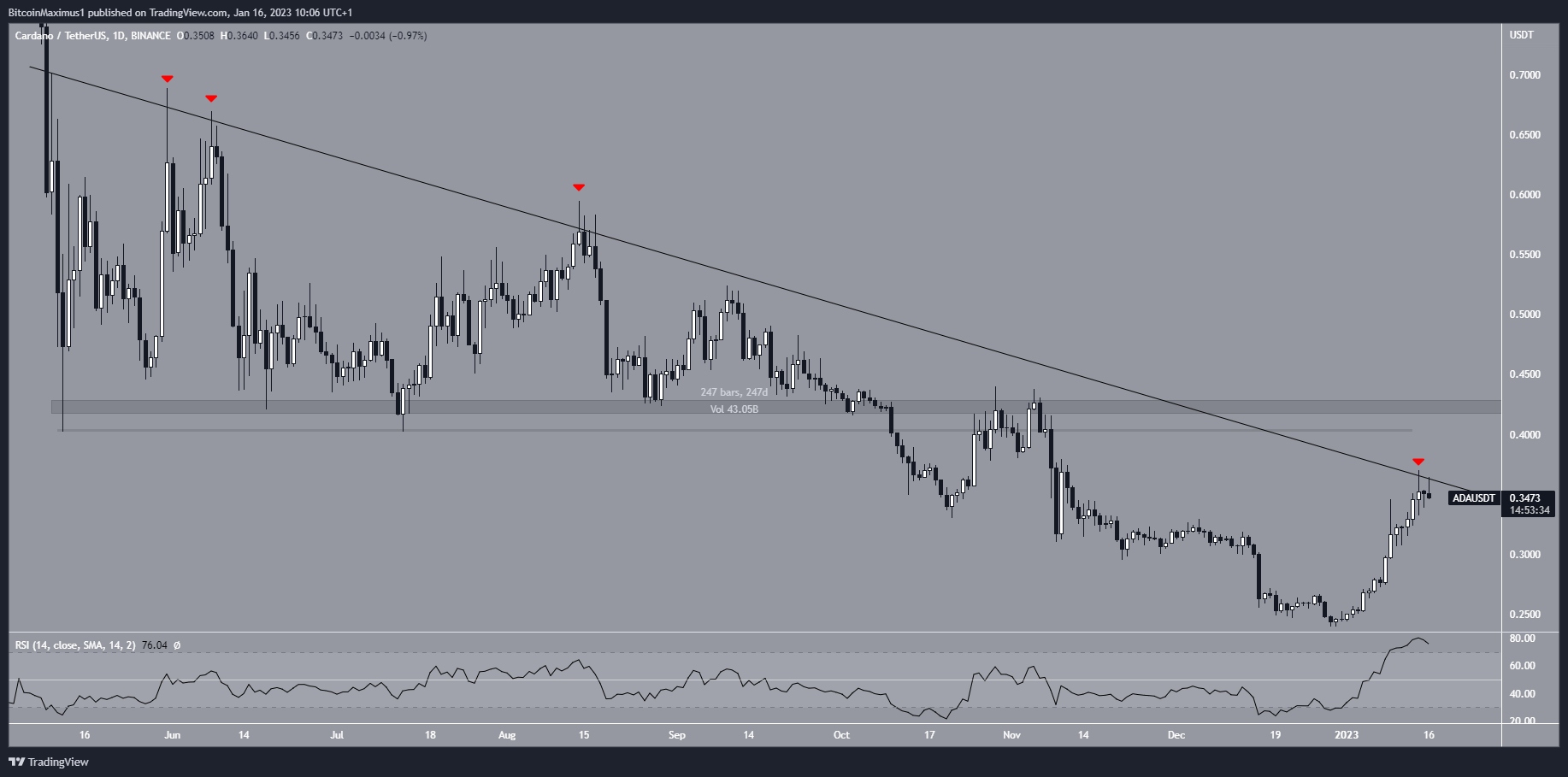 Phân tích giá ADA cho thấy nó đã chạm đến đường kháng cự giảm dần hình thành kể từ tháng 8/2022 và có thể bị từ chối tại đường này. Theo báo cáo, hoạt động trên mạng blockchain Cardano cũng đang gia tăng.