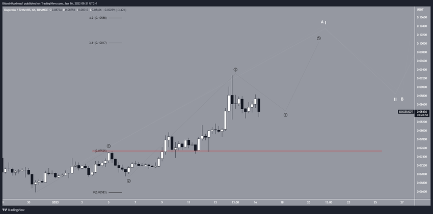Đối với số lượng sóng dài hạn của Dogecoin, không chắc liệu mức tăng này là một phần của sóng dài hạn 1 hay sóng A (màu trắng). Trong khi việc hoàn thành đợt sóng đầu tiên có thể dẫn đến mức cao mới mọi thời đại, thì đợt thứ hai chỉ ra rằng đây là một đợt phục hồi điều chỉnh. Trong mọi trường hợp, cả hai số liệu đều cho thấy xu hướng tăng trong ngắn hạn. Việc giảm xuống dưới mức cao nhất của sóng phụ (đường màu đỏ) ở mức 0.075 USD sẽ làm mất hiệu lực phân tích DOGE tăng giá này.