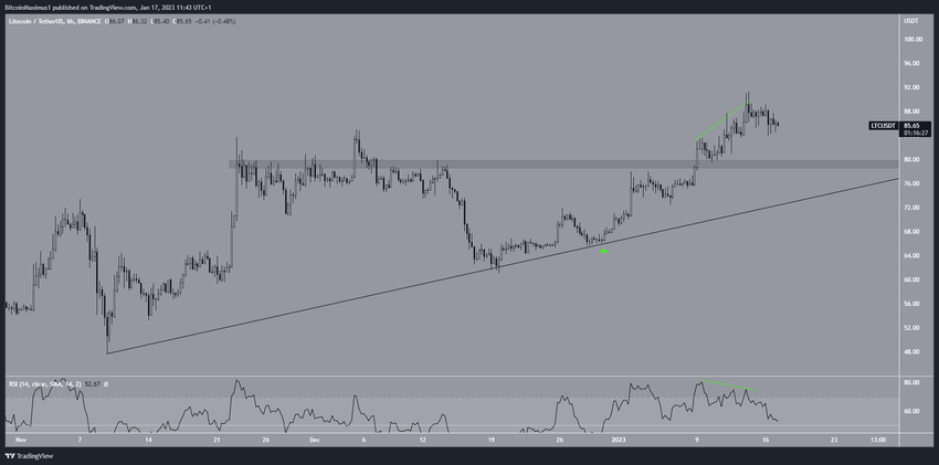 Bất chấp sự gia tăng, chỉ báo RSI 6 giờ có dấu hiệu suy yếu dưới dạng phân kỳ giảm giá (đường màu xanh lá cây). Do đó, nó có thể quay lại kiểm tra lại khu vực 79 USD dưới dạng hỗ trợ. Khu vực này sẽ sớm trùng với đường hỗ trợ tăng dần. Do sự hợp lưu này, xu hướng giá Litecoin vẫn tăng miễn là nó không đóng cửa dưới mức hợp lưu 79 USD của các mức hỗ trợ.