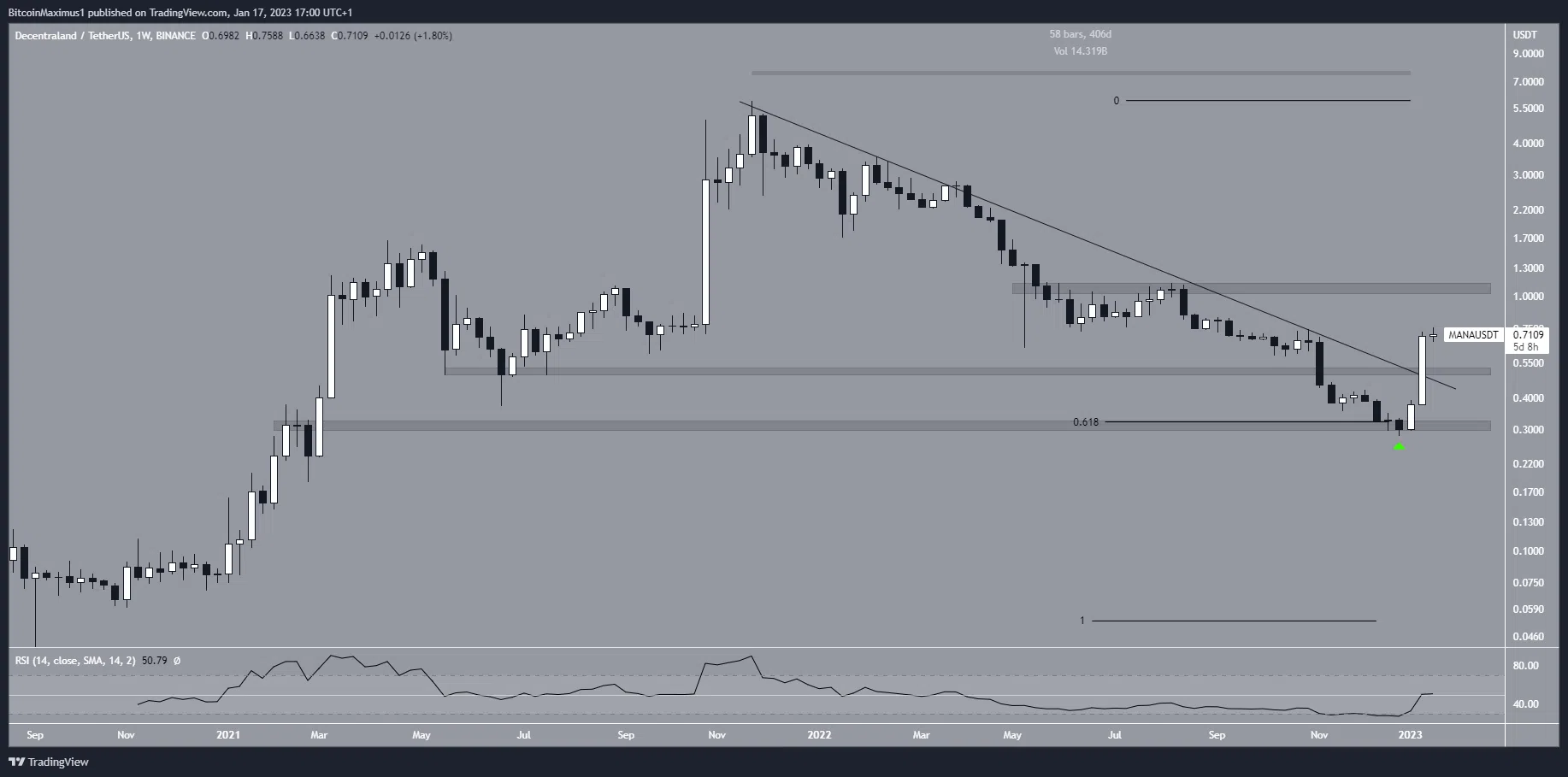 Theo đó, quá trình phân tích giá MANA BeInCrypto nhận thấy kể từ khi đạt mức ATH là 5.90 USD vào tháng 11/2021, giá đồng coin này đã giảm xuống dưới đường kháng cự giảm dần. Chuyển động đi xuống dẫn đến mức thấp nhất tại 0.28 USD vào tháng 12/2022.