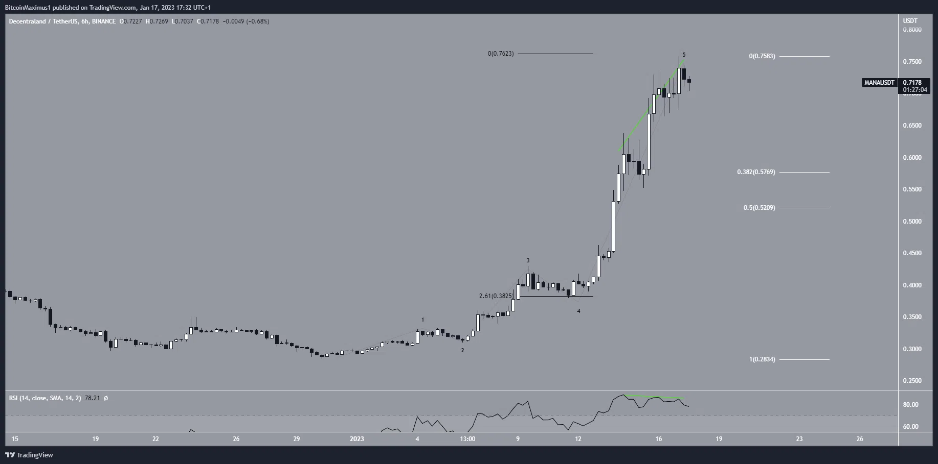 Tiếp tục phân tích giá MANA, BeInCrypto nhận thấy số lượng sóng cũng hỗ trợ khả năng giá Decentraland sắp sửa điều chỉnh. Đồng coin này dường như đang ở trong sóng năm và cũng là sóng cuối của một chuyển động đi lên bắt đầu vào ngày 01/1. Nếu vậy, sóng năm có phần mở rộng quá lớn và dài gấp 2.61 lần chiều dài của sóng một và sóng ba cộng lại (màu đen).