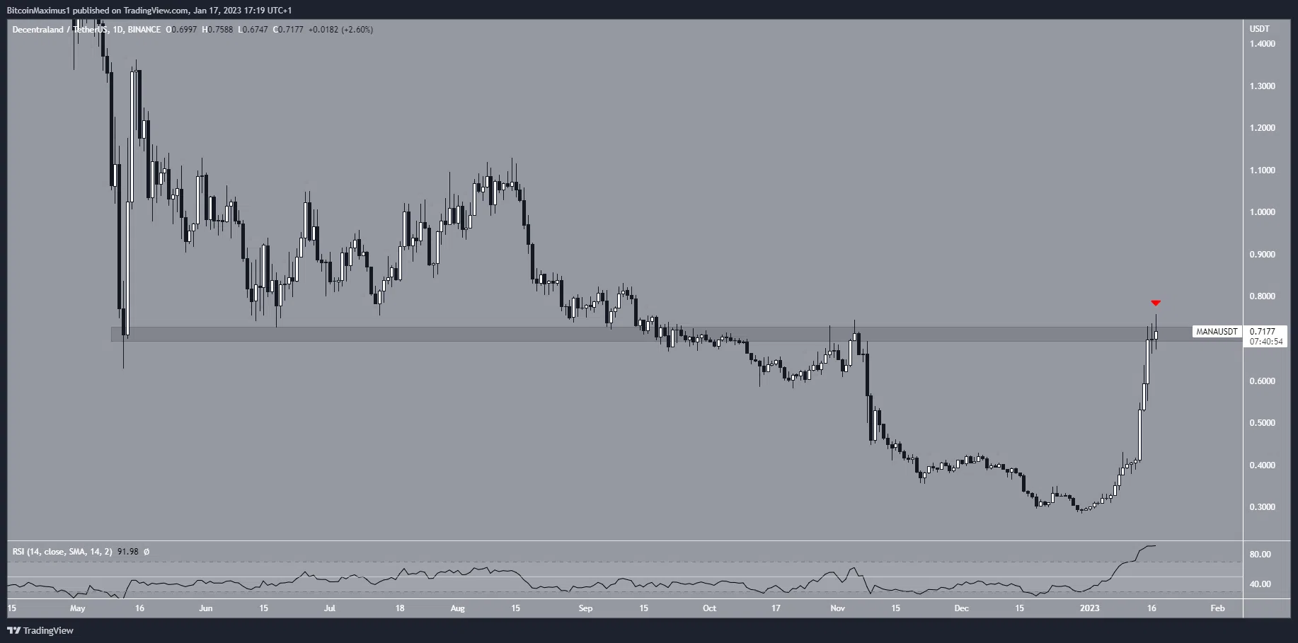 Kể từ khi bật lên, giá MANA đã tăng 150%. Tuần trước, nó đã thoát ra khỏi cả đường kháng cự giảm dần dài hạn và khu vực nằm ngang 0.51 USD, hiện được kỳ vọng sẽ đóng vai trò là hỗ trợ. Hơn nữa, chỉ báo RSI tuần đang trong quá trình di chuyển lên trên 50. Nếu thành công, giá MANA có thể tăng lên mức kháng cự tiếp theo ở là 1.1 USD. Ngược lại, việc giá đóng nến tuần dưới 0.51 USD có nghĩa xu hướng vẫn là giảm.