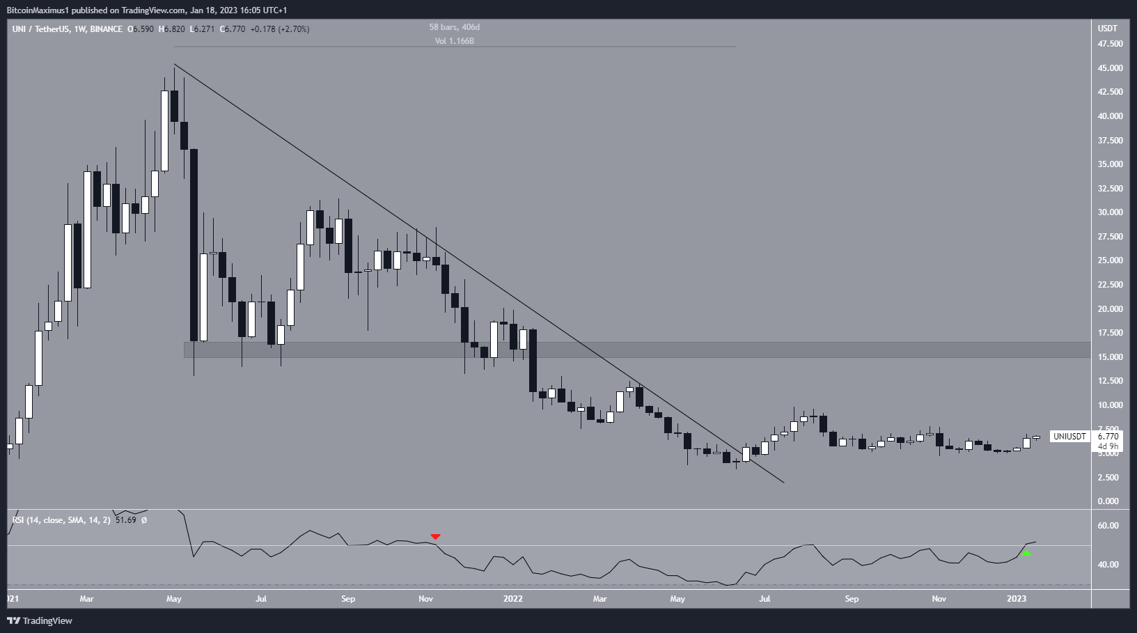 Phân tích giá Uniswap cho thấy nó đã giảm xuống dưới đường kháng cự giảm dần dài hạn kể từ khi đạt mức ATH là 45 USD vào tháng 5/2021. Chuyển động đi xuống đã dẫn đến mức thấp nhất tại 3.33 USD vào tháng 6/2022. Vào cuối tháng trước, UNI giá bứt phá khỏi đường kháng cự cho thấy đợt điều chỉnh dài hạn có thể đã kết thúc. Tuy nhiên, giá UNI đã không duy trì xu hướng tăng và giữ ở gần với mức trước khi đột phá. Trong mọi trường hợp, nếu xu hướng tăng tiếp tục, mức kháng cự dài hạn tiếp theo sẽ là 15.70 USD.