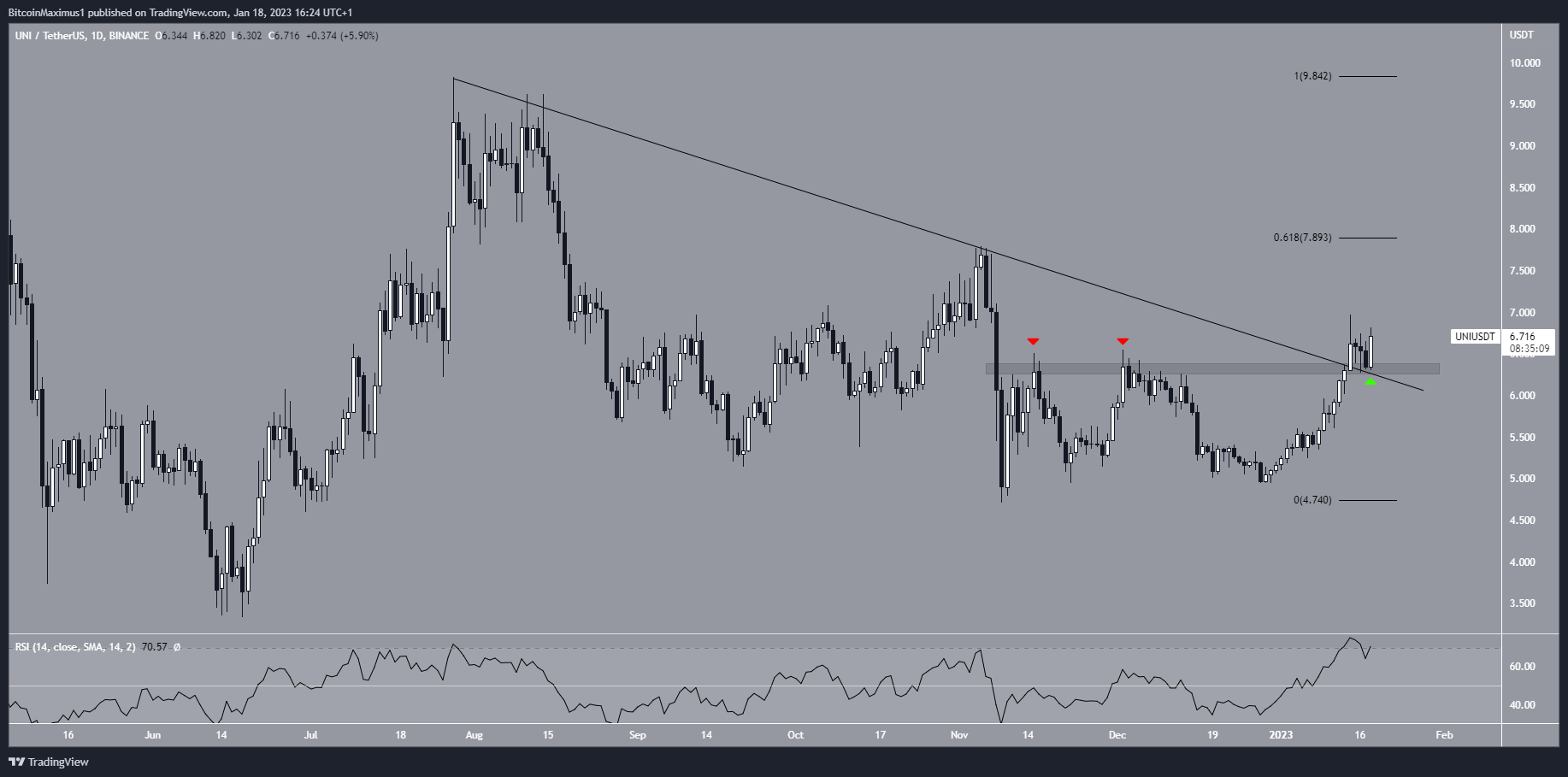 Tại thời điểm BeInCrypto viết bài, phân tích giá Uniswap cho thấy nó đang có vùng kháng cự chính tại 7.90 USD. Vì đây cũng là Fib thoái lui 0.618, nếu giá tăng lên trên mức này, xu hướng tăng có thể kéo dài và hướng tới vùng 15.70 USD. Vì chỉ báo RSI ngày đang tăng và không tạo ra bất kỳ phân kỳ giảm giá nào, nên nó cũng hỗ trợ dự đoán giá này. Tuy nhiên, nếu giá đóng nến ngày dưới khu vực 6.30 USD, kịch bản tăng giá trên sẽ bị mất hiệu lực. Theo đó, giá UNI có thể giảm xuống còn 5 USD.
