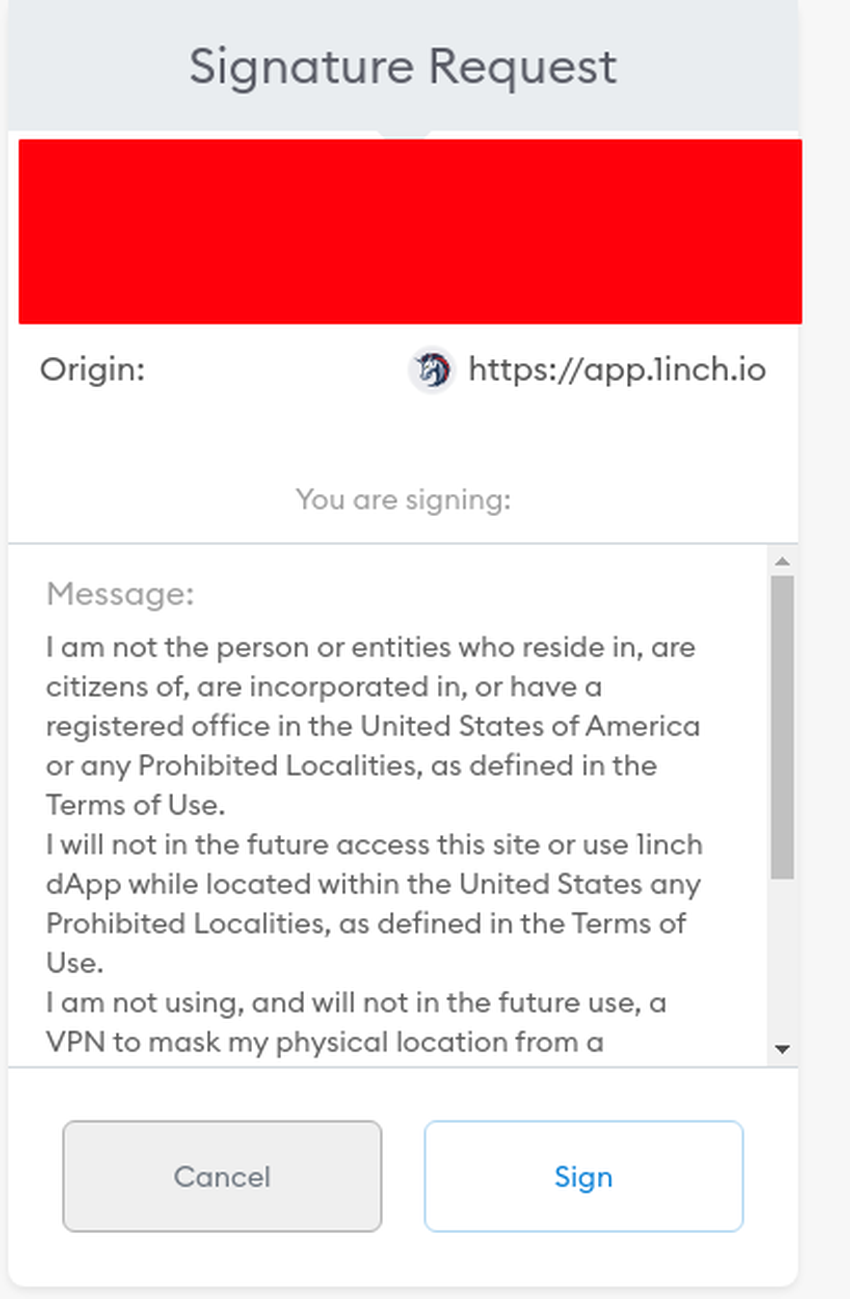 Hơn nữa, người dùng cũng báo cáo rằng 1inch hiện đang yêu cầu người dùng ký một giao dịch trực tuyến. Người dùng phải đảm bảo rằng họ đang sử dụng dịch vụ từ bên ngoài các khu vực bị hạn chế.