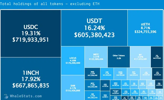 Nhìn chung, tổng số tiền 1INCH được nắm giữ bởi 100 ví Ethereum hàng đầu là khoảng 668 triệu USD và con số này chiếm 17.92%. Tổng giá trị USDT và SHIB nắm giữ lần lượt vào khoảng 605 triệu USD và 155 triệu USD.