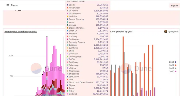 1inch nằm trong số các sàn giao dịch phi tập trung (DEX) có khối lượng giao dịch nhiều nhất. Sau khi đạt khối lượng khoảng 972 triệu USD vào tháng 1, giao thức này đã đạt mức cao nhất là 1 tỷ USD vào tháng 6. Trong suốt tháng 8, khối lượng giao dịch giảm xuống còn 672 triệu USD, thấp hơn so với các DEX đối thủ như DODO, SushiSwap, Curve Finance, Synthetix, Ox Native, Uniswap và Balancer.