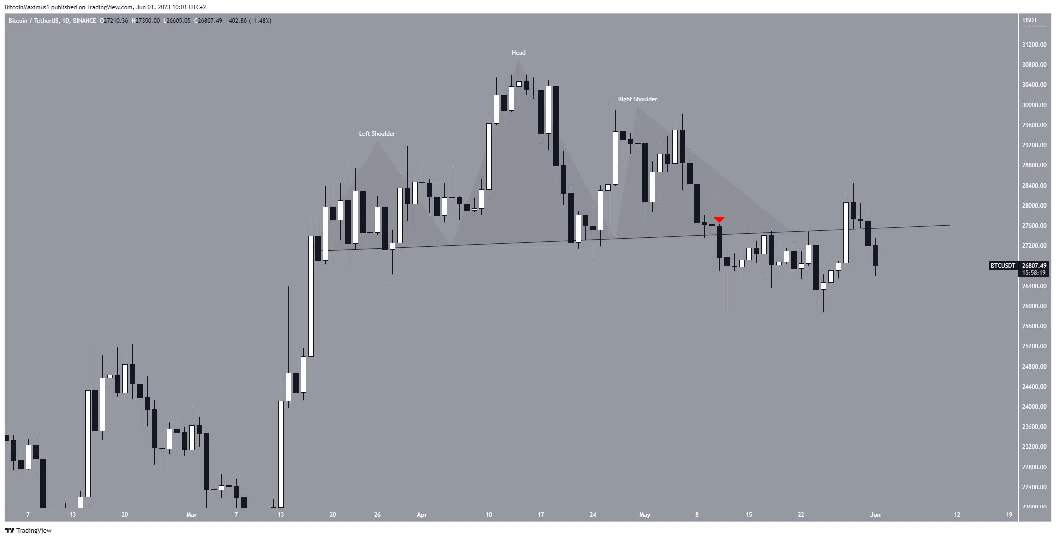 Trader tiền điện tử @Anbessa100 đã tweet mô hình Vai-Đầu-Vai (Head & Shoulders). Mô hình gợi ý rằng một cú breakdown sẽ xảy ra và giá BTC sẽ giảm xuống còn 25,000 USD.