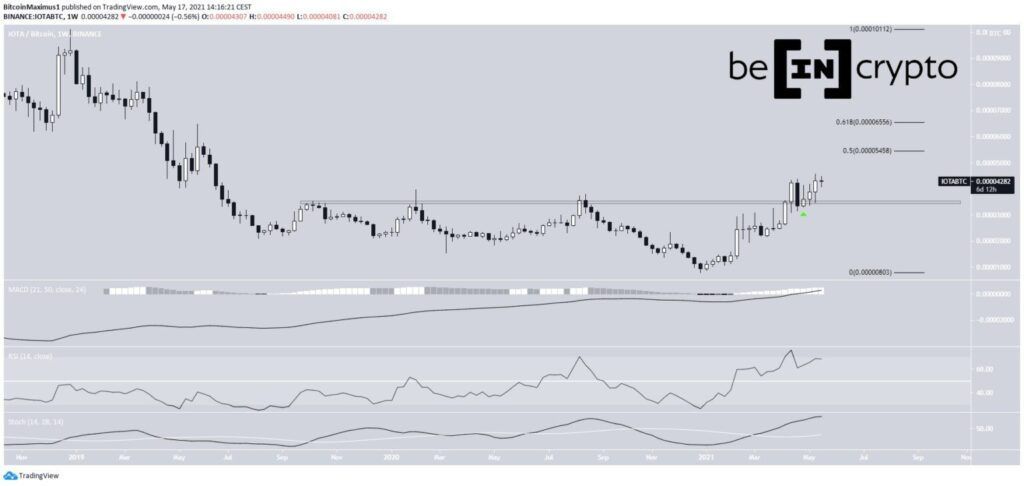 Cặp giao dịch IOTA/BTC đã tăng kể từ tháng 12 năm 2020. Vào đầu tháng 5 năm 2021, nó đã thoát ra khỏi khu vực 3,500 satoshi. Sau đó, IOTA đã quay trở lại để xác nhận mức này là mức hỗ trợ (mũi tên màu xanh lá cây). Và từ đó đã di chuyển lên trên.