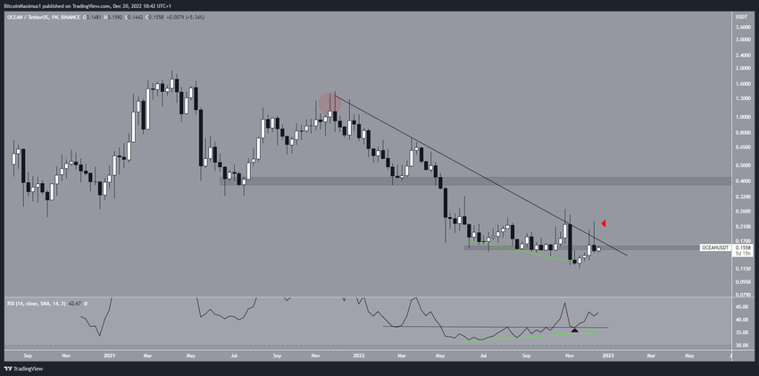 OCEAN là Altcoin đáng chú ý đầu tiên mùa Giáng sinh 2022. Giá của Ocean Protocol (OCEAN) đã giảm kể từ khi đạt mức ATH là 1.94 USD vào tháng 4/2021. Nó tạo ra mức đỉnh thấp hơn vào tháng 11/2021 (vòng tròn màu đỏ) và sau đó lao xuống dưới đường kháng cự giảm dần.