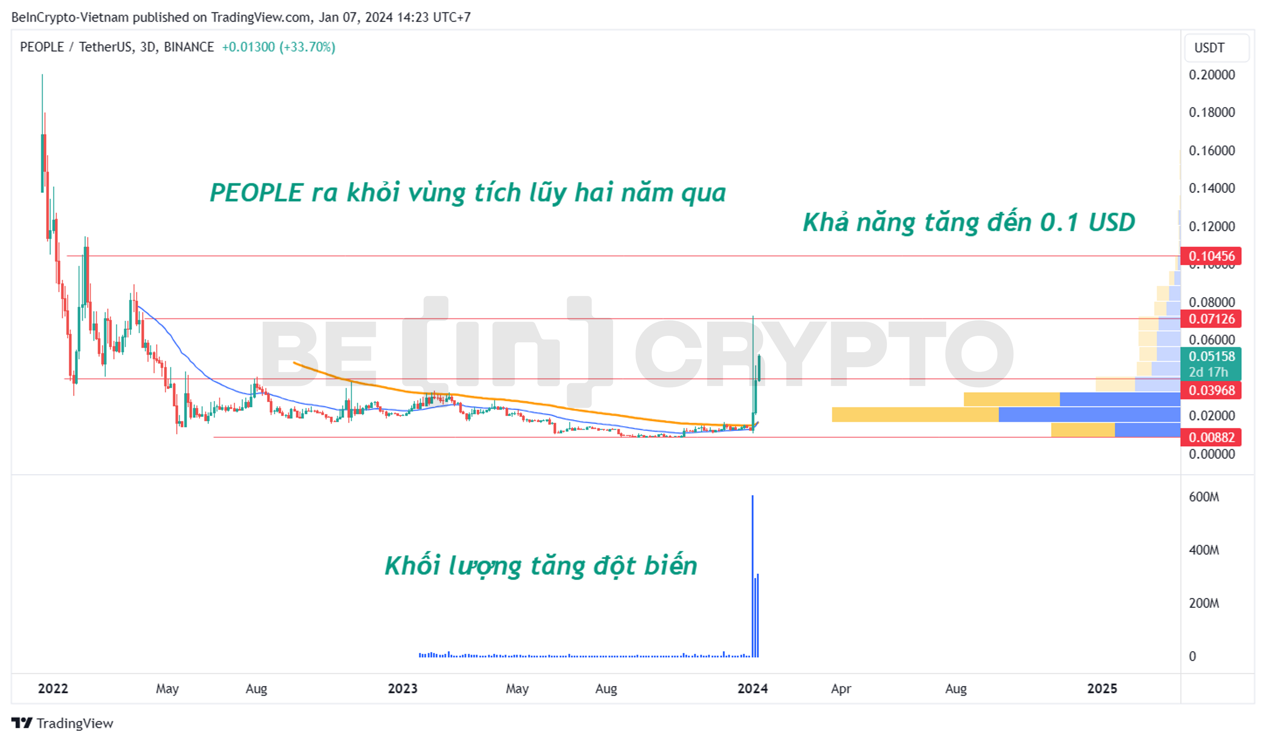 - Về kỹ thuật, PEOPLE đã thoát khỏi vùng tích lũy lớn sau khi tăng 500% đầu năm 2024, đồng thời xác nhận EMA34 cắt lên EMA89 khung 3 ngày. Giá PEOPLE có khả năng còn tăng tiếp đến 2 kháng cự 0.07 USD và 0.1 USD. Năm 2023, PEOPLE từng giảm về 0.008 USD, nghĩa là đến nay giá PEOPLE đã ghi nhận mức tăng đến 700%.