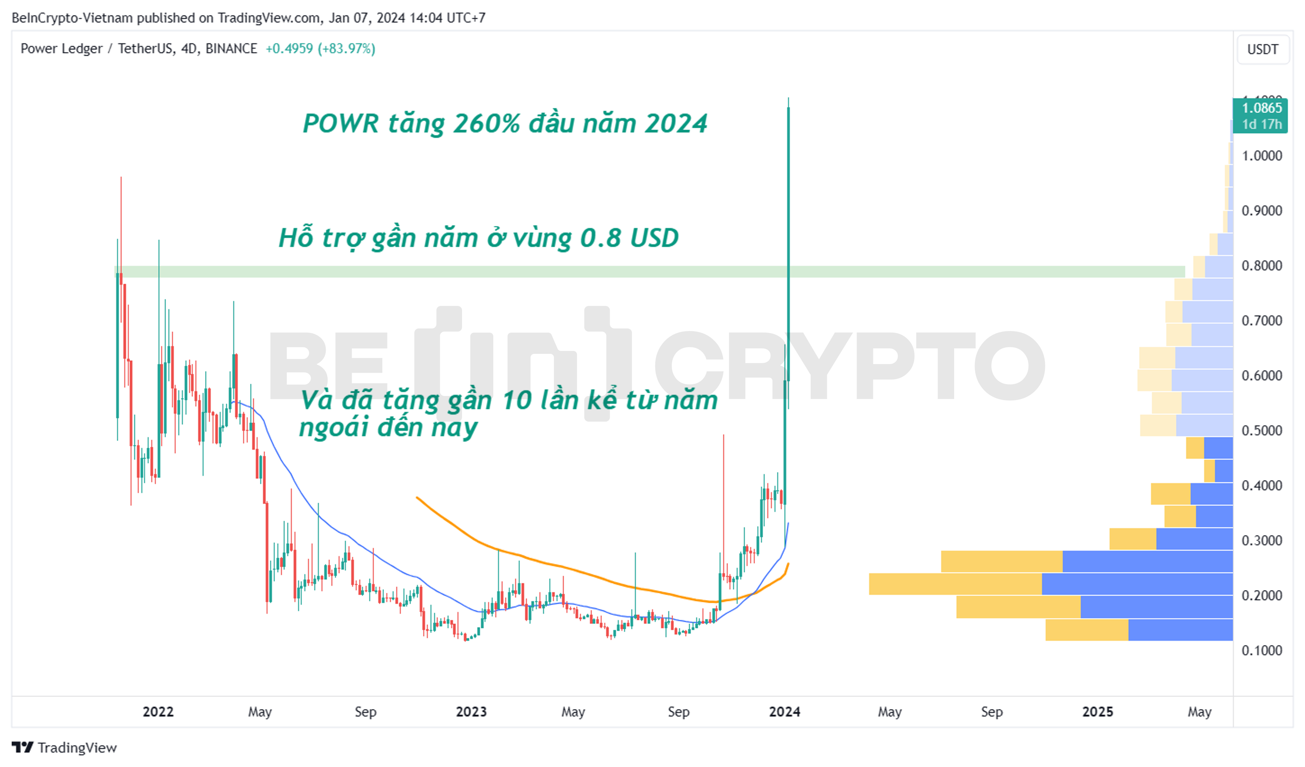 - Giá POWR đã tăng 260% trong những ngày đầu năm 2024. Và nếu tính từ đáy năm 2023, thì giá POWR đã tăng gấp gần 10 lần. Hiện POWR đã vượt 1 USD và chưa có dấu hiệu điều chỉnh. Vùng đỉnh cũ và đồng thời cũng là hỗ trợ gần của POWR là vùng 0.80 USD.