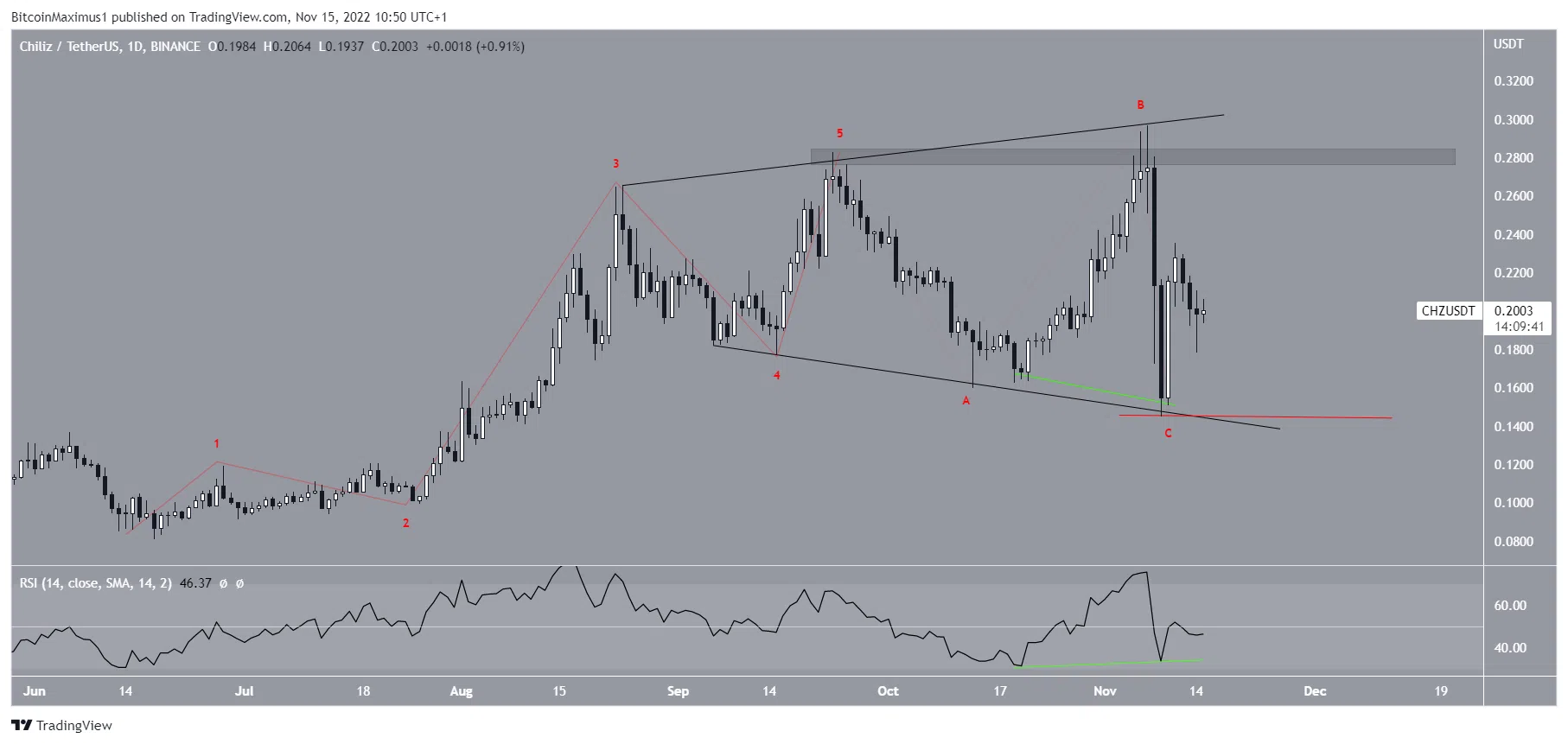 Giá Chiliz (CHZ) đã được giao dịch bên trong một nêm tăng dần, mở rộng kể từ ngày 25/8. Vào ngày 09/11, nó đã bật lên tại đường hỗ trợ kênh và tạo ra một cây nến nhấn chìm tăng vào ngày hôm sau. Toàn bộ chuyển động kể từ mức thấp nhất trong tháng 6 trông giống như một xung lực tăng giá đã hoàn thành, sau đó là một đợt điều chỉnh đi ngang bất thường. Nếu việc đo đạc các bước sóng là chính xác, giá Chiliz sẽ kiểm tra lại vùng kháng cự 0.28 USD và bứt phá. Khả năng này cũng được hỗ trợ bởi sự phân kỳ tăng trong chỉ số RSI khung ngày (đường màu xanh lá cây)