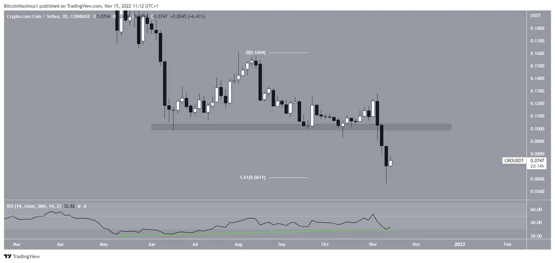 Giá Crypto.com (CRO) đã giảm kể từ khi đạt mức cao 0.16 USD vào ngày 01/8. Ban đầu, nó bật lên trên vùng hỗ trợ ngang 0.10 USD, nhưng đã bị phá vỡ từ vùng này vào ngày 09/11. Nó đạt mức thấp mới là 0.05 USD vào ngày 14/11.