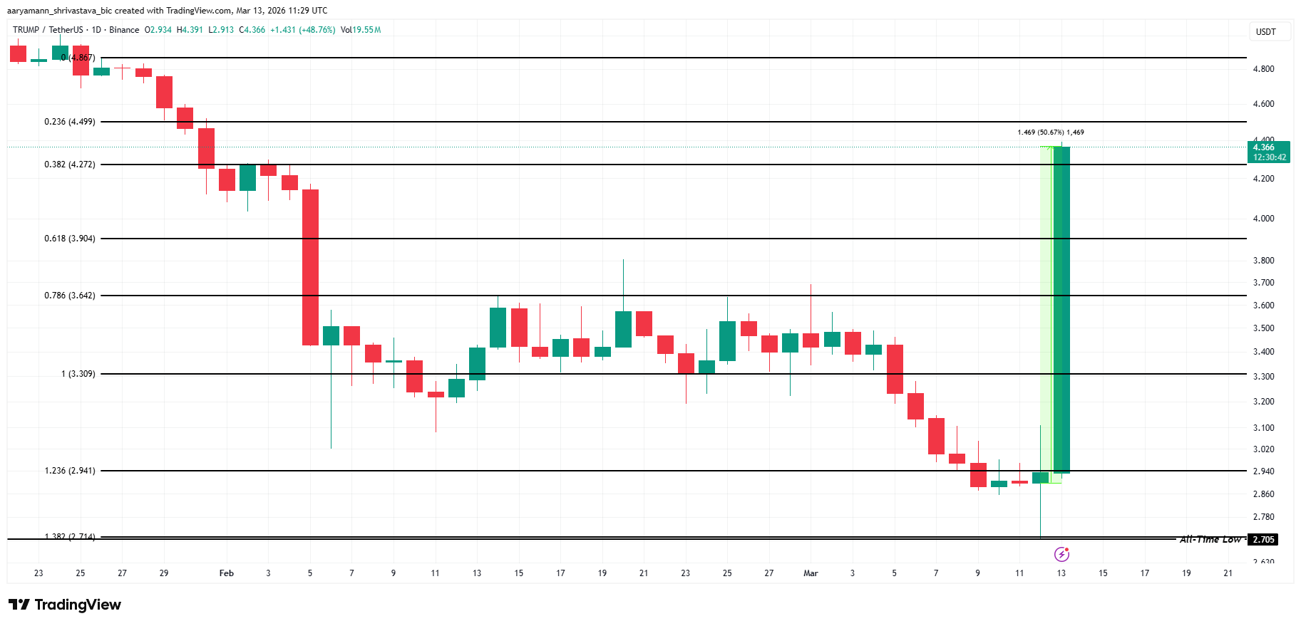TRUMP đã có cú tăng hơn 50% chỉ trong 24 giờ, với phần lớn đà tăng diễn ra trong ngày thứ Sáu. Động lực này đã đẩy giá altcoin này lên 4.36 USD. Cú đảo chiều mạnh từ vùng đáy gần đây cho thấy tâm lý ngắn hạn đã thay đổi đáng kể, thu hút dòng tiền đầu cơ mới vào token này.