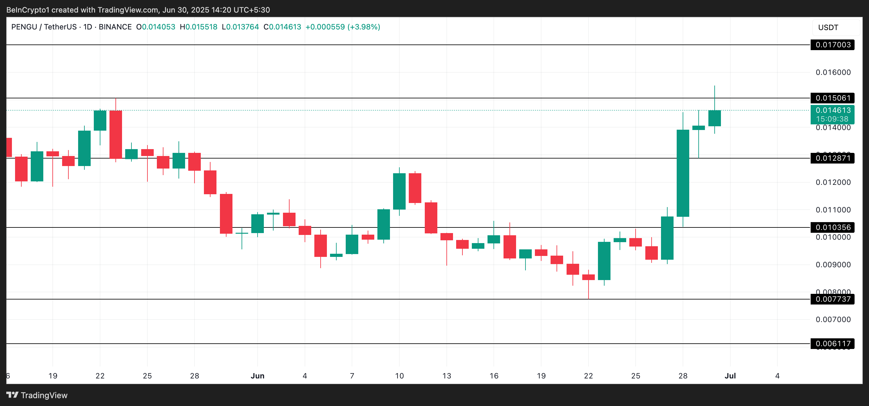 PENGU đã tăng 70% trong tuần qua và hiện đang giao dịch ở mức 0.014 USD. Trong phiên giao dịch sớm tại châu Á vào thứ Hai, altcoin này đã tăng lên mức cao nhất trong 47 ngày là 0.0155 USD khi nhu cầu tăng vọt.