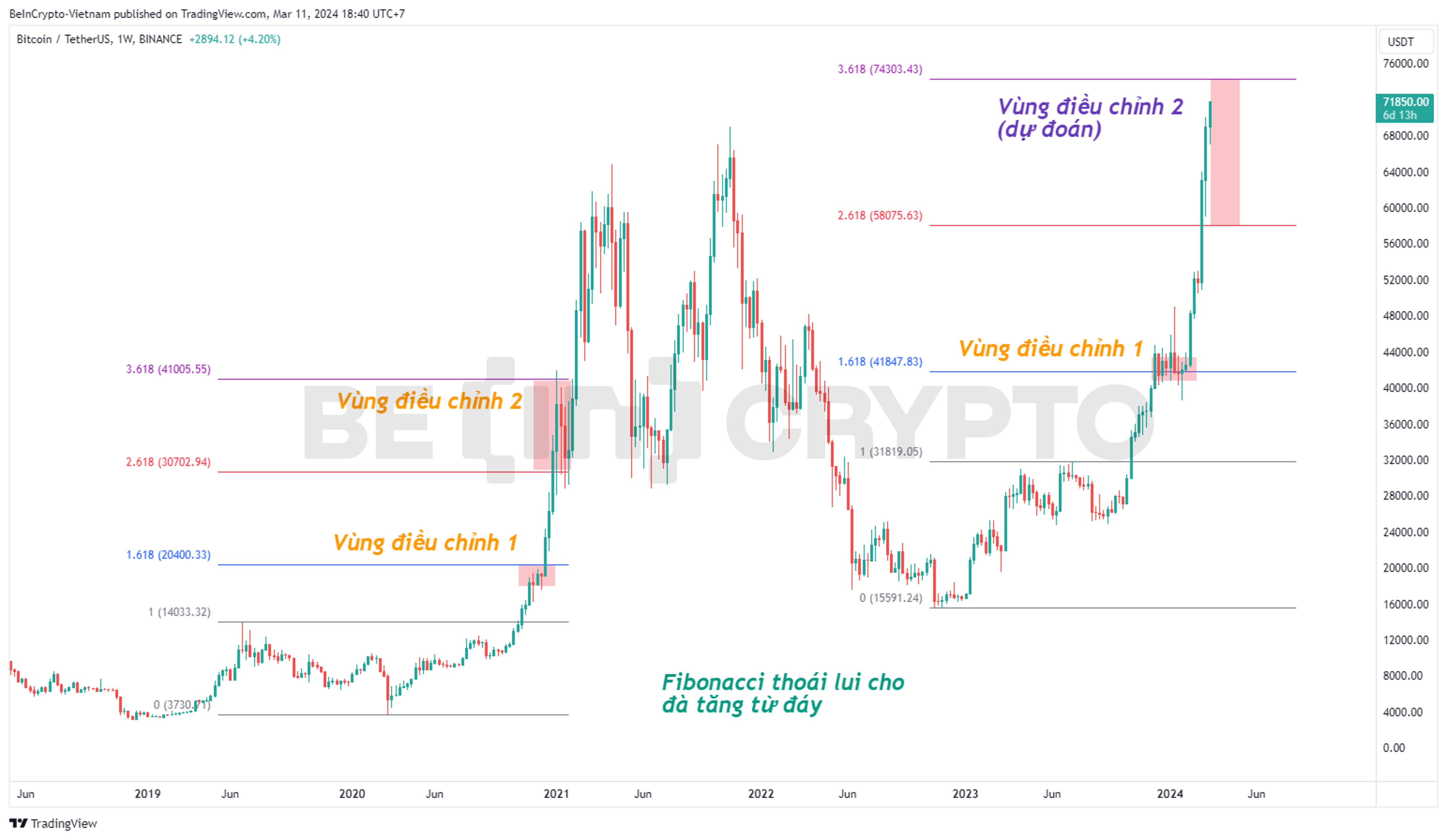Một vài công cụ từ phân tích kỹ thuật có thể được áp dụng khi BTC vừa lập mức cao mới trên 71,000 USD. Sau đây là những tổng hợp các phương pháp kỹ thuật giúp xác định target đỉnh của BTC trong ngắn hạn.