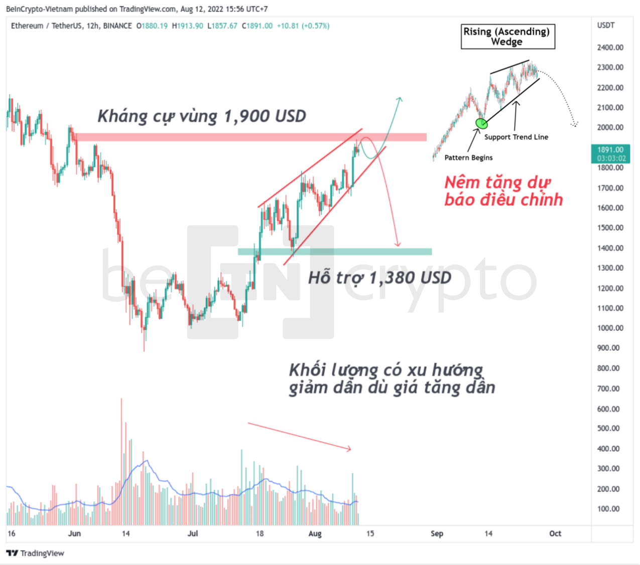 Mô hình nêm tăng dần rõ ràng hơn khi giá ETH không thể giao dịch trên 1,900 USD dù tin tức CPI được công bố mang tính tức cực. Nhìn lại sự phân bố khối lượng của mô hình nêm tăng, thì càng về sau khối lượng càng ít hơn trước (trên Binance).