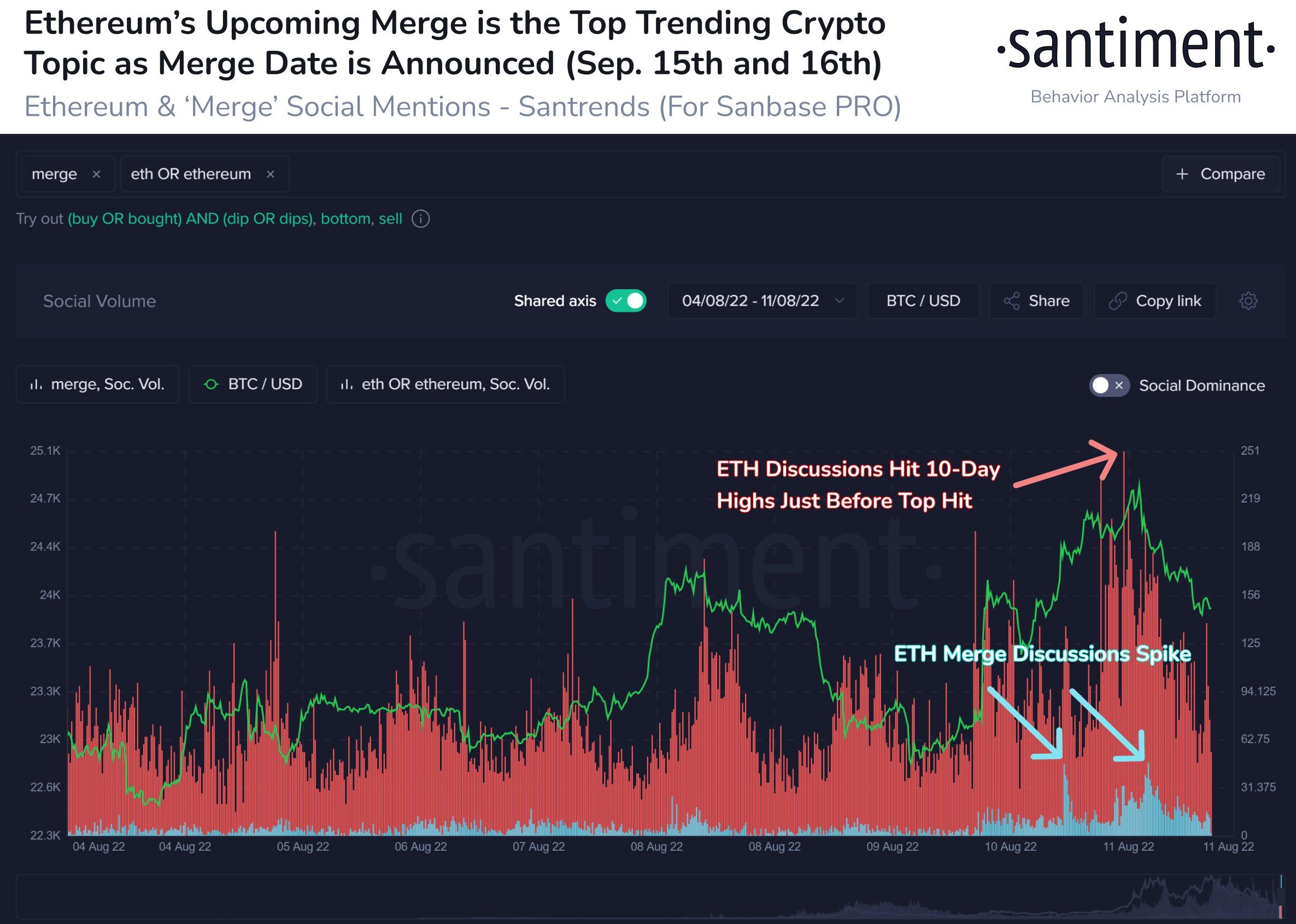 Theo Santiment, chủ đề liên quan đến “The Merge” tăng đột biến nửa đầu tháng 8.