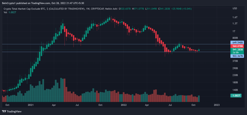 Tuy nhiên, điều đó có thể thay đổi theo chiều hướng tốt hơn. Do việc giá Bitcoin chuyển sang xu hướng tăng. Đáng chú ý, vốn hóa thị trường altcoin dường như đang lập biểu đồ phục hồi từ mốc dưới 900 tỷ USD.