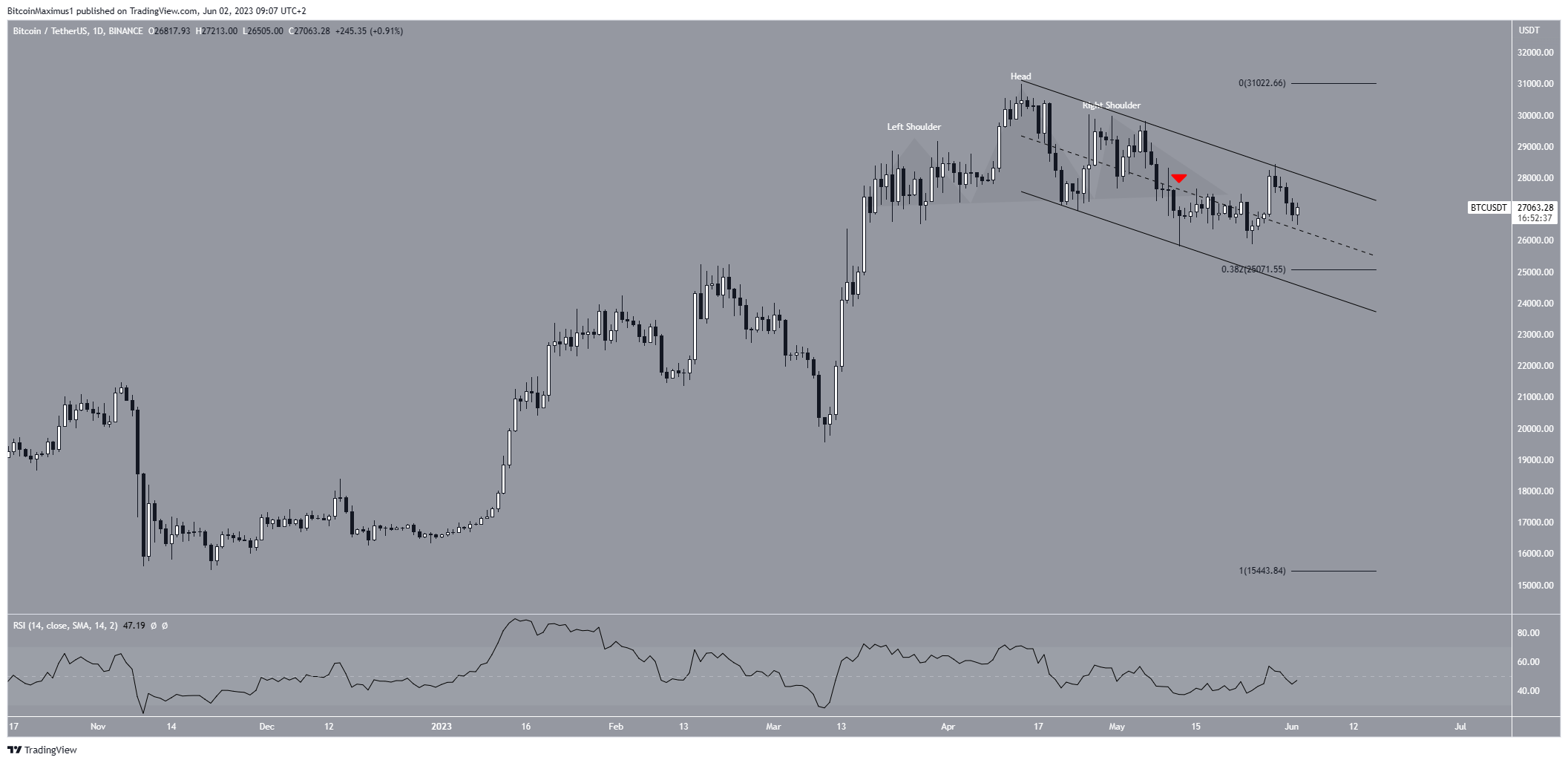 Bitcoin đã phá vỡ (biểu tượng màu đỏ) khỏi mô hình Vai-Đầu-Vai vào ngày 11 tháng 5. Vai-Đầu-Vai (Head & Shoulders) được coi là một mô hình giảm giá. Do đó, một cú breakdown có thể sẽ xảy ra.