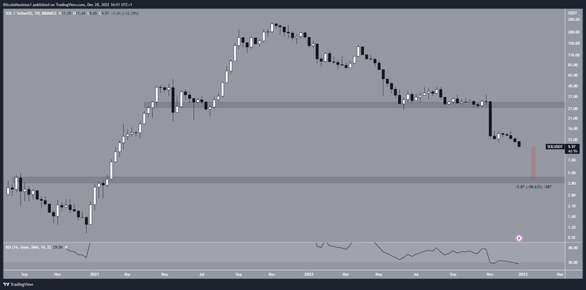 Dấu hiệu giảm đầu tiên là vùng hỗ trợ gần nhất là 4.3 USD, tương đương giảm 58.6% so với giá hiện tại. Vì không có hỗ trợ nào giữa giá hiện tại và vùng hỗ trợ 4.3 USD nên giá SOL có thể xác nhận mức giá này vào cuối tháng 1/2023. Dấu hiệu giảm giá thứ hai là chỉ số RSI hàng tuần đã giảm xuống dưới 30 và đang giảm mà không tạo ra dấu hiệu phân kỳ tăng. Do đó, dự đoán về tiền điện tử SOL có khả năng nhất là chuyển động giảm tiến về vùng hỗ trợ 4.3 USD. Để xu hướng dài hạn là tăng, giá Solana sẽ phải lấy lại vùng kháng cự 29 USD.