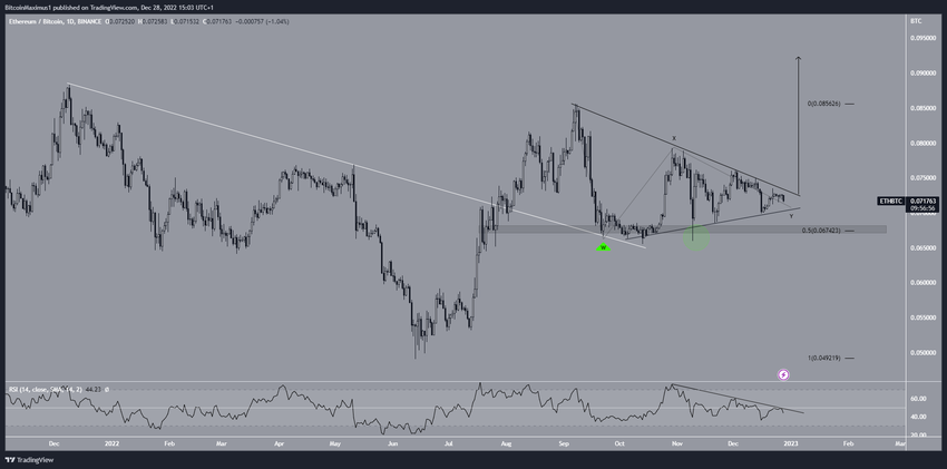 Tuy nhiên, chỉ báo RSI hàng ngày vẫn đang giảm do nó không thể thoát ra khỏi đường kháng cự giảm dần và bị đường 50 từ chối. Do đó, việc giá ETH có thoát ra khỏi tam giác hay đóng dưới khu vực 0.057 BTC hay không sẽ quyết định dự đoán về tiền điện tử ETH cho tháng 1/2023.