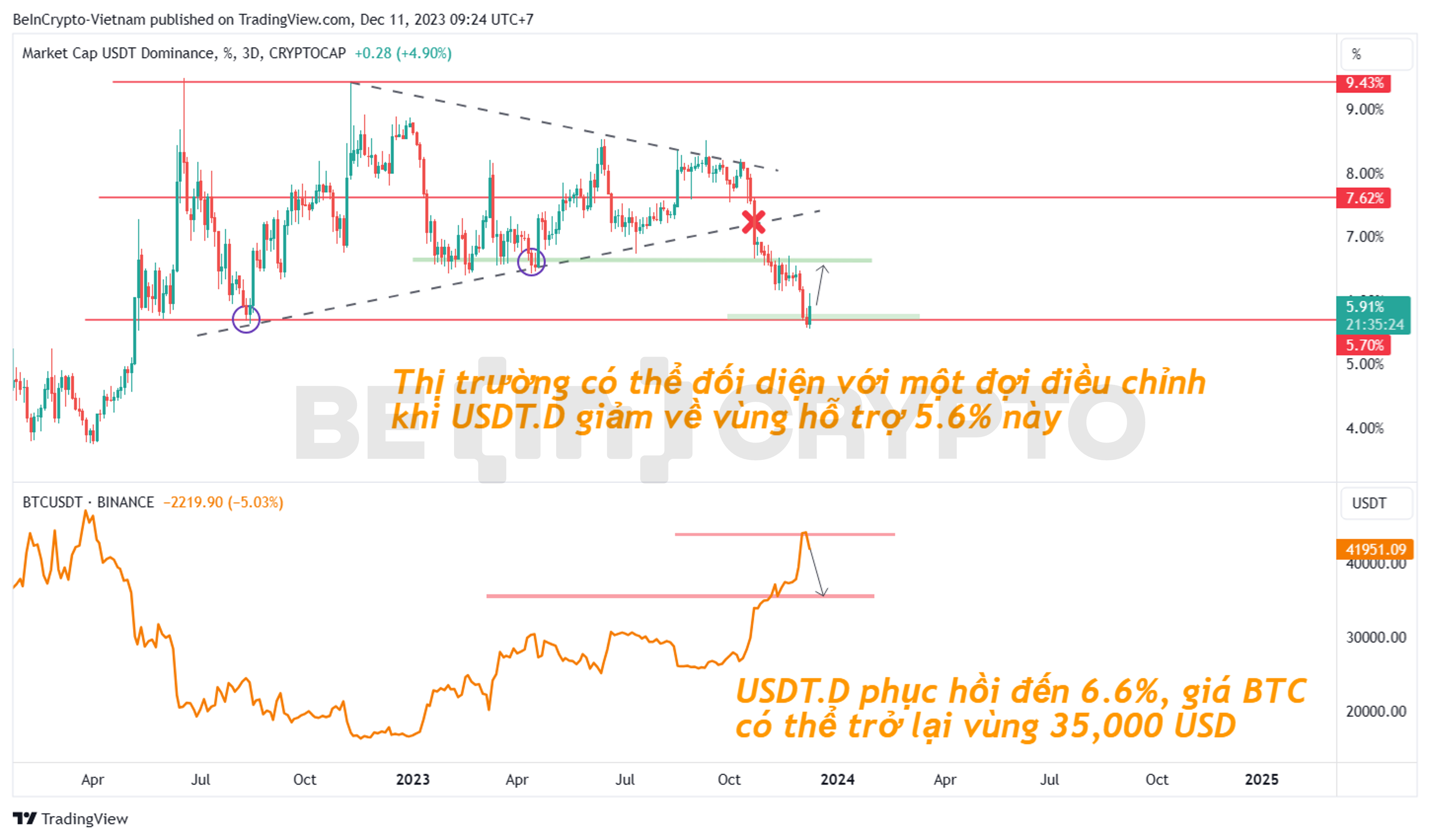 - Kháng cự của USDT.D hiện tại là vùng 6.6%. Tại những thời điểm mà USDT.D ở 6.6% thì tương đương với giá Bitcoin ở vùng 35,000 USD. Kháng cự này gợi ý rằng, nếu USDT.D tiếp tục phục hồi đến 6.6% thì đà giảm của Bitcoin có thể về vùng 35,000 USD.