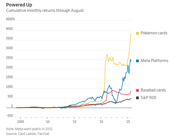 Tyler Neville, đồng dẫn chương trình Forward Guidance, đã nhấn mạnh một biểu đồ so sánh hiệu suất đầu tư của các tài sản khác nhau từ 2005 đến khoảng 2025. Biểu đồ bao gồm thẻ bài Pokémon, Meta Platforms, thẻ bài bóng chày và chỉ số S&P 500.