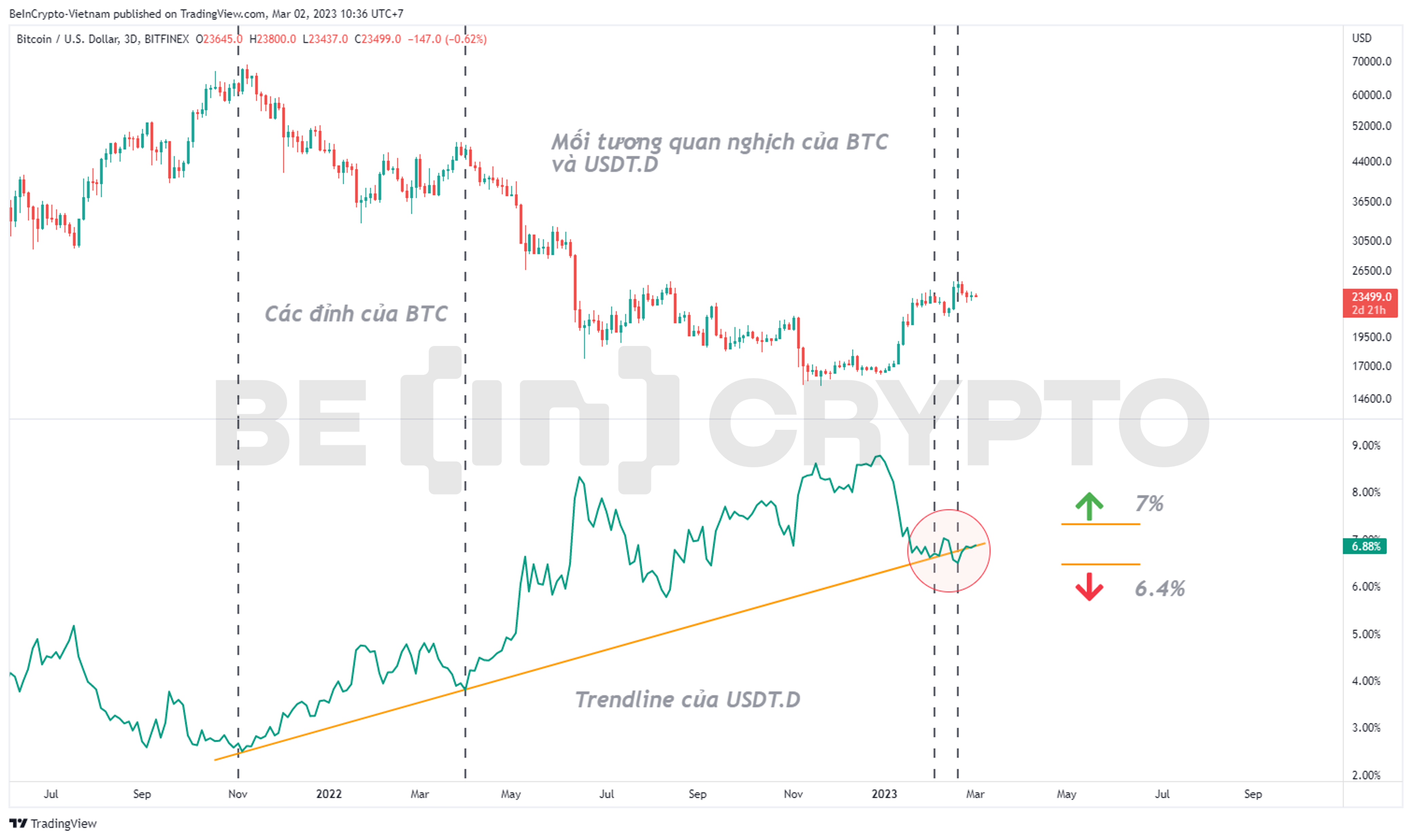 Hai đường biến động của BTC và USDT.D nhìn như hai hình đối xứng qua mặt gương, tương quan rất mật thiết. Tưởng rằng trong tháng 2, USDT.D sẽ bật lên từ trendline kéo dài hơn một năm qua. Nhưng nó lại liên tục bám trendline và chưa khẳng định xu hướng. Tại đây, dữ liệu mới gợi ý mức 7% và 6.4% sẽ là chặn trên và dưới. Trong tháng 3 này có thể sẽ là thời gian xác định USDT.D biến động theo hướng nào.