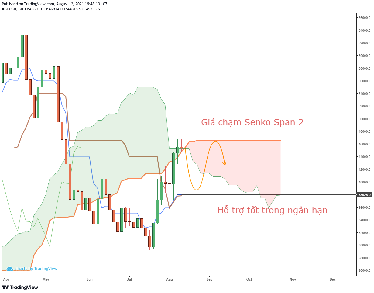 - Tuy nhiên, không thể phủ nhận động lực tăng trước đó của Bitcoin. Nên mức hỗ trợ thấy được chính là đường kijun (trong khunh 3D). Và đường này đánh dấu mức hỗ trợ 38,000 đô la. Đường màu cam trong hình là dự đoán kịch bản tích cực giá sẽ quay lại senko span 2 lần nữa sau khi chạm hỗ trợ này.