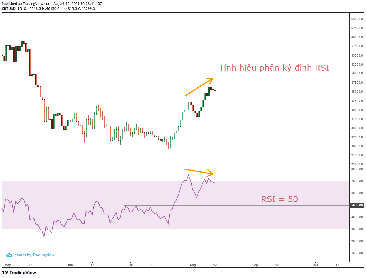 - Từ ngày 23/7/2021, khi RSI chính thức vượt 50. Bitcoin bắt đầu một động lực tăng giá. Và tiếp tục duy trì cho đến khi RSI chạm đến 70. Khi RSI chạm đến 70, thì Bitcoin bắt đầu có đợt suy giảm đầu tiên.