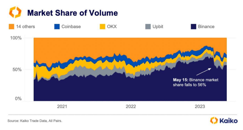 Về khối lượng giao dịch tổng thể trên các sàn giao dịch, Binance đã chứng kiến sự sụt giảm mạnh mẽ. Thị phần của Binance đã giảm xuống còn 56%, giảm mạnh 15% so với mức đỉnh vào nửa cuối năm 2022.