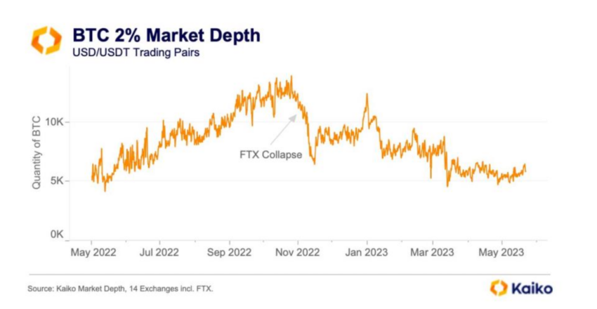 Mặc dù độ sâu thị trường tính bằng USD vẫn ổn định. Thanh khoản không thay đổi khi được đo bằng độ sâu thị trường 2% tính bằng coin, nghĩa là độ sâu của giá mua và giá bán trong khoảng 2% giá giao dịch hiện tại. Điều này phản ánh mức độ ảm đạm ngày càng tăng đối với thị trường tiền điện tử.