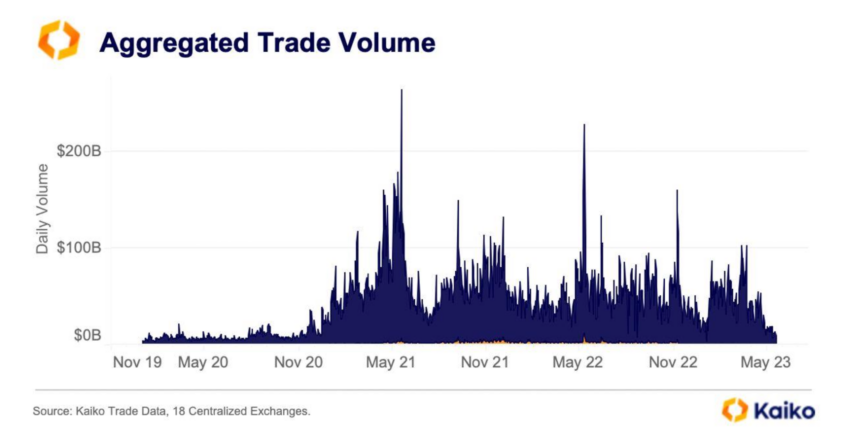 Tổng khối lượng giao dịch hàng ngày trong tháng 5 đã sụt giảm từ mức ấn tượng 23 tỷ USD xuống còn 9 tỷ USD. Xu hướng giảm này báo hiệu mức độ quan tâm đầu cơ đang giảm dần và tâm lý thờ ơ ngày càng tăng đối với thị trường tiền điện tử.