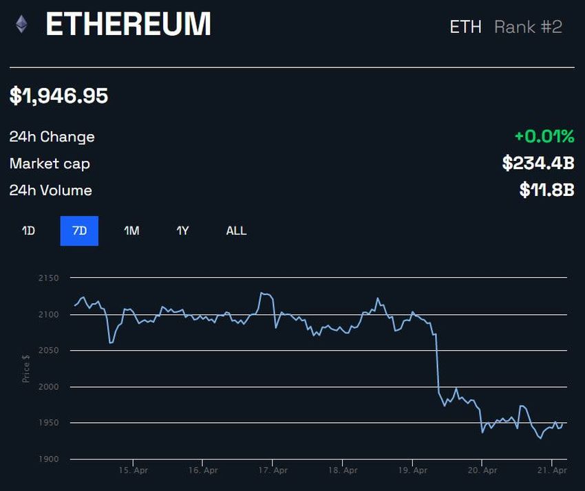 Ví Kraken đã rút một lượng lớn ETH được đặt cọc (staking) trong khoảng một ngày qua. Động thái này đã làm giảm giá Ethereum, vốn đã bắt đầu sụt giảm so với mức cao nhất trong 11 tháng. Giá ETH đã giảm 8.5% kể từ mức cao nhất năm 2023 vào ngày 17/4. ETH đang giao dịch trong ngày quanh mức 1,947 USD tại thời điểm viết bài.