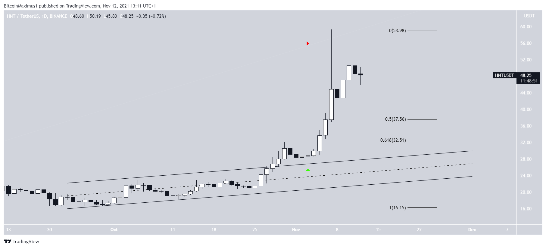 Giá HNT đã tăng lên kể từ khi thoát ra khỏi một kênh giá song song tăng dần (biểu tượng màu xanh lá cây) vào ngày 3 tháng 11. Đà tăng đã đưa đồng altcoin tăng lên mức đỉnh mới tại 59.27 USD vào ngày 7 tháng 11. Tuy nhiên, HNT đã tạo ra một cây nến với bóng nến trên dài ngay sau khi tạo đỉnh mới và giá HNT đã quay đầu giảm kể tử đó.
