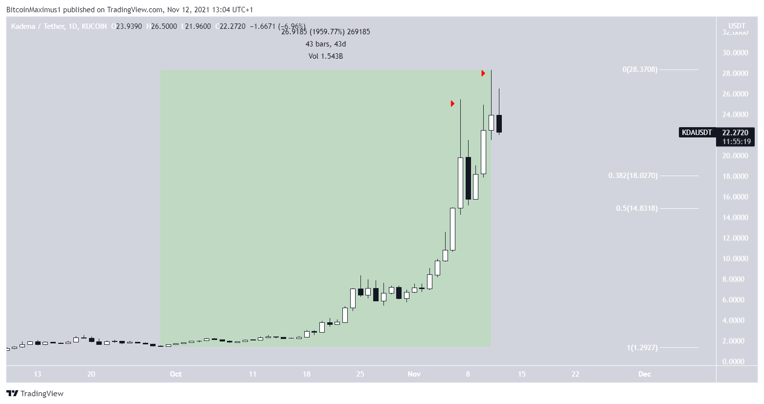 Giá KDA đã tăng với tốc độ nhanh chóng kể từ ngày 29 tháng 9. Trong khoảng thời gian 43 ngày, nó đã tăng 1,952%. Đà tăng đã đưa đồng altcoin này tới mức đỉnh mới tại 28.30 USD vào ngày 10 tháng 11.