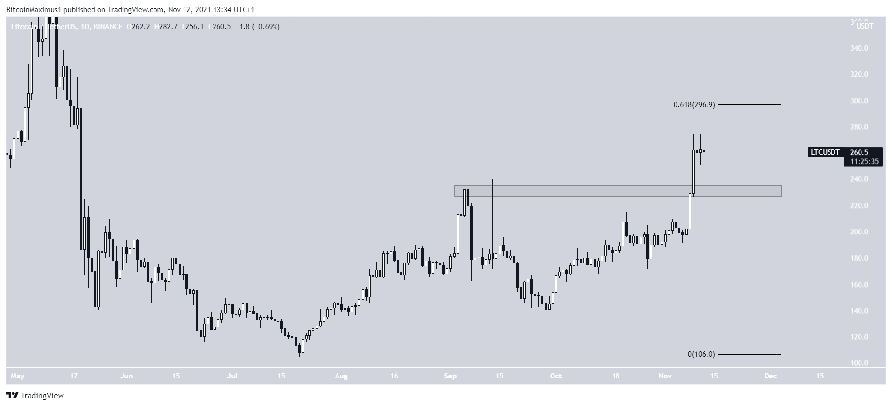 LTC đã tăng với tốc độ nhanh chóng kể từ ngày 7 tháng 11. Ngày hôm sau, đồng altcoin này đã bứt phá trên vùng kháng cự ngang 230 USD và đạt mức đỉnh mới tại 295.7 USD vào ngày 10 tháng 11.