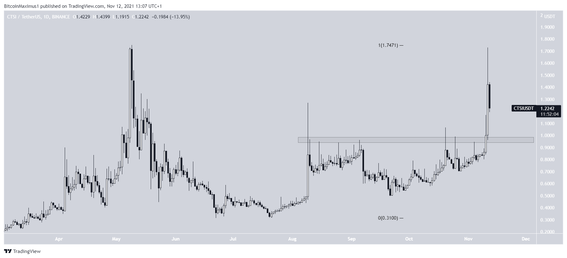 Giá CTSI đã tăng lên kể từ ngày 22 tháng 9. Đà tăng đã đưa đồng altcoin này bứt phá lên trên mức 0.96 USD vào ngày 10 tháng 11. Ngày hôm sau, CTSI tiếp tục đạt mức cao 1.73 USD. Tuy nhiên, nó vẫn chưa thể phá vỡ mức đỉnh lịch sử cũ, mặc dù chỉ còn cách mức đỉnh cũ 0.02 USD.