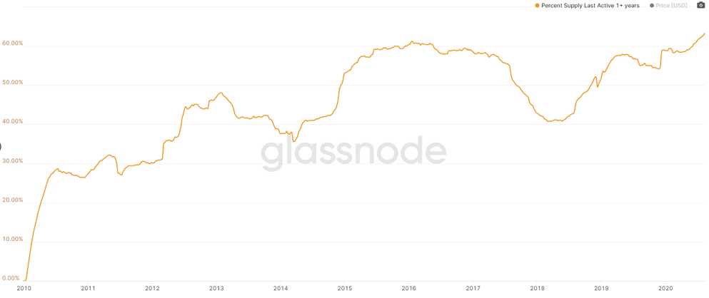 Lập luận thứ 3 của nhà phân tích này là 63% tổng số Bitcoin đã không được di chuyển trong hơn 1 năm. Lần cuối cùng ghi nhận mức cao này là vào thời điểm bắt đầu giai đoạn bùng nổ của Bitcoin, kéo dài từ năm 2015 đến 2017 mà đã chứng kiến giá Bitcoin leo lên đến 20.000 USD.