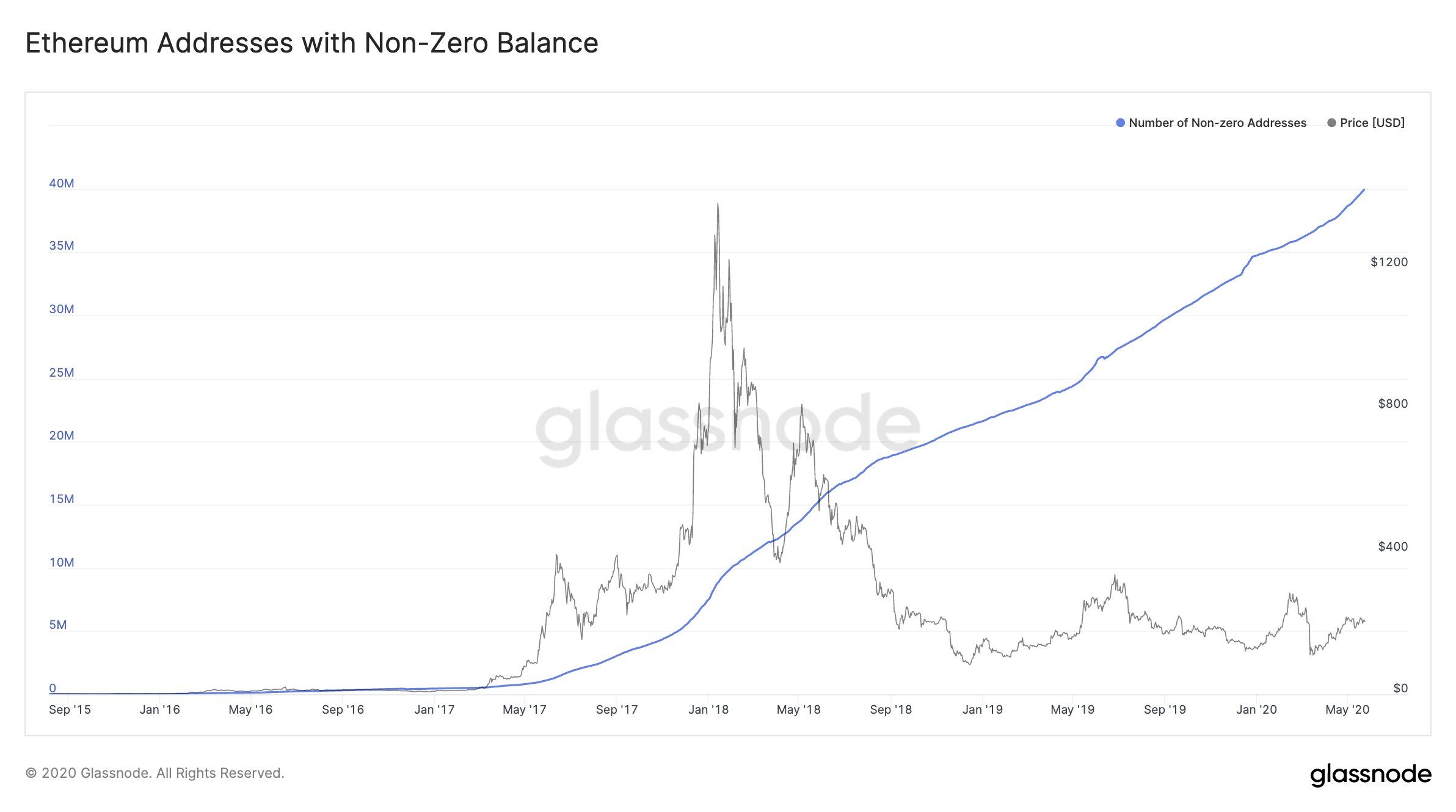 Nhà cung cấp phân tích thị trường trên chuỗi Glassnode đã tìm hiểu sâu hơn về các địa chỉ ví trên mạng lưới Ethereum và nhận thấy sự tồn tại của một xu hướng giá tăng. Hiện tại, có 40 triệu địa chỉ ví ETH đang nắm giữ một phần của tài sản kỹ thuật số này.