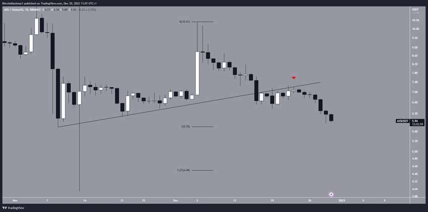 Sau khi xác nhận nó là ngưỡng kháng cự vào ngày 22/12 (biểu tượng màu đỏ), giá AXS tiếp tục chuyển động đi xuống và gần với mức thấp mới hàng năm. Nếu xu hướng giảm tiếp tục, vùng hỗ trợ gần nhất sẽ là 4.50 USD, được tạo bởi mức thoái lui Fibo bên ngoài 1.61 của lần bật lên gần đây nhất. Nếu AXS giành lại đường hỗ trợ tăng dần có nghĩa là xu hướng đang tăng.