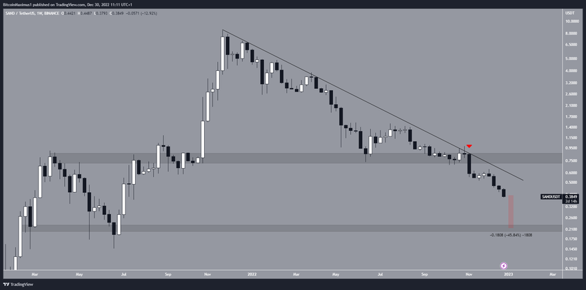 Cuối cùng trong danh sách các Altcoin giảm mạnh nhất tuần là SAND (The Sandbox). Giá SAND đã giảm xuống dưới đường kháng cự giảm dần kể từ khi đạt mức ATH là 7.94 USD vào tháng 11/2021. Đường này đã từ chối SAND vào tuần đầu tiên của tháng 11 (biểu tượng màu đỏ), phá vỡ vùng hỗ trợ ngang 0.8 USD. Điều này dẫn đến mức thấp 0.38 USD vào ngày 29/12.