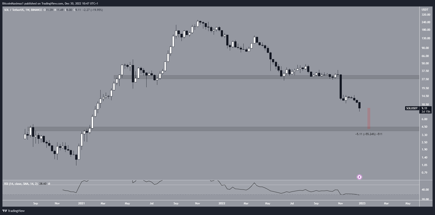 Sau XCN, SOL của Solana là Altcoin giảm mạnh nhất tiếp theo trong tuần. Giá SOL đã phá vỡ vùng hỗ trợ nằm ngang 30 USD trong tuần đầu tiên của tháng 11. Chuyển động đi xuống diễn ra nhanh chóng, dẫn đến mức thấp nhất là 8 USD vào ngày 30/12. Nếu xu hướng đi xuống tiếp tục, vùng hỗ trợ gần nhất tiếp theo là 4.2 USD, giảm 55% so với giá hiện tại.