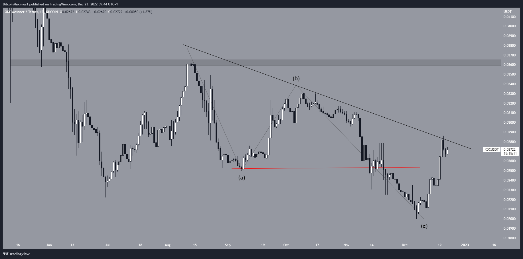Sau BinaryX, XDC Network là Altcoin tăng mạnh nhất tuần qua với mức tăng 10.23% được BeInCrypto ghi nhận. Giá XDC đã giảm xuống dưới đường kháng cự giảm dần kể từ ngày 11/8. Chuyển động giảm dẫn đến mức thấp 0.02 USD vào ngày 07/12. Do sự chồng chéo trong các chuyển động (đường màu đỏ), việc giảm này có thể là một sự điều chỉnh theo cấu trúc A-B-C đã hoàn thành (đen). Theo đó, giá XDC đã phục hồi mạnh mẽ từ mức thấp nhất vào ngày 07/12, nó trở lại đường kháng cự.